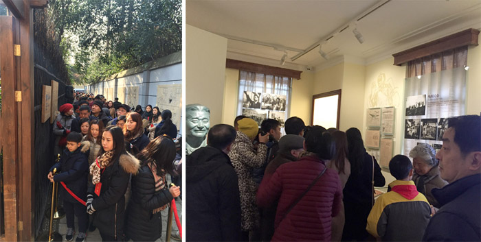 国画大师陈佩秋为张乐平故居提笔写下对联庆贺故居开放(右一为陈佩秋之子谢定伟)。