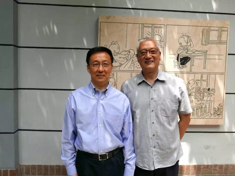 韩正与张乐平幼子张慰军在张乐平故居前合影留念。(陈正宝摄)