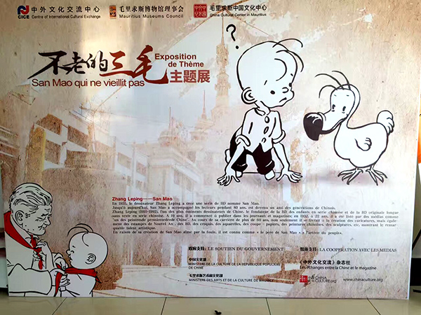 由文化部中外文化交流中心、毛里求斯中国文化中心和毛里求斯博物馆理事会主办的“不老的三毛”主题展,8月25日在毛里求斯中国文化中心盛大开幕。毛里求斯共和国总统法吉姆、中国大使馆大使李立、文化部中外文化交流中心副主任刘红革、中国大使馆文化参赞松雁群等致辞。此次展出至9月8日结束,后还将赴毛里求斯各地进行巡展。