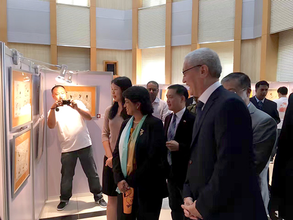 毛里求斯共和国总统法吉姆在张乐平先生之子张慰军等陪同下参观展览