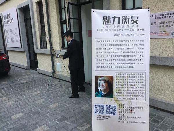 “张乐平漫画艺术赏析”讲座,作为“魅力衡复——2016衡复艺术季”的活动内容之一,12月18日在上海衡山路的复兴路历史文化风貌区举办,由著名漫画家郑辛遥主讲。本次活动由上海衡复投资发展有限公司,天平路街道办事处,湖南路街道办事处主办。