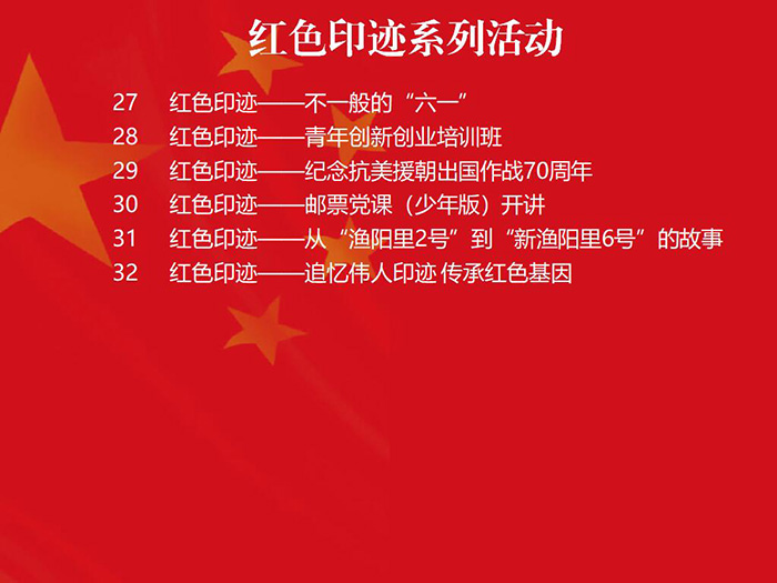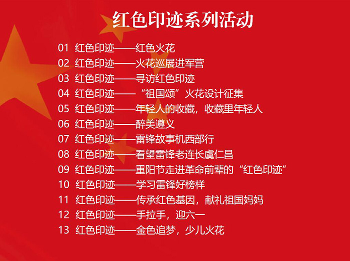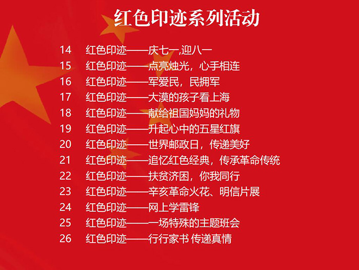 近几年来,红色印迹系列活动开展了“学习雷锋好榜样”“升起心中的五星红旗”“扶贫济困,你我同行”等32个活动。指导单位为共青团上海市委员会,主办单位由上海市青少年发展基金会、上海市希望工程办公室等50个单位组成,上海三毛形象发展有限公司也是主办单位之一。