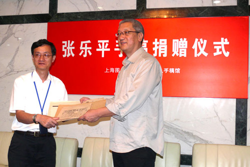 在“三毛”74岁生日之际,张乐平先生的儿子张慰军代表家属,向上海图书馆中国文化名人手稿馆捐赠了一批手稿和画稿。本次捐赠的画稿包括《三毛流浪记》的封面设计稿、描图稿和1949年4月“三毛生活展览会”所用的美术字体,以及张乐平创作的最后一部“三毛”连环漫画《三毛学法》的原稿。此外还有张乐平的学习笔记和发言稿的手迹原件。张乐平生前与海内外文化名人有着广泛的交流,此批捐赠手稿中有许多著名文化界人士写给张乐平的信件:(按姓名笔划)巴金、方成、王乐天、六龄童、韦布、乐小英、冯英子、叶浅予、华君武、米谷、严恭、张光宇、杨可扬、杨华生、沈同衡、沈柔坚、周汝昌、姜维朴、郁风、赵超构、唐云、黄永玉、黄佐临、黄宗英、黄苗子、龚之方、森哲郎、鲁少飞、詹同、赖少其、廖冰兄、缪印堂、潘际垌、戴敦邦、魏绍昌和台湾女作家三毛。上海图书馆副馆长、手稿馆馆长周德明,历史文献中心主任、手稿馆副馆长黄显功等出席仪式。
