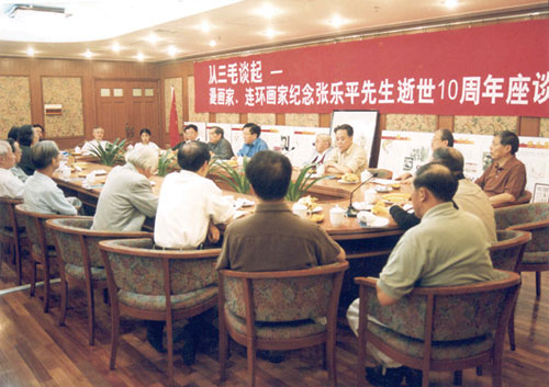 由解放日报社和上海市美术家协会主办,主办单位负责人宋超、王富荣、朱国荣、徐昌酩、郑辛遥和特伟、丁锡满、洪荒、王白水、施明德、王益生、张楚良、戴敦邦、范生福、杨宏富、叶雄、朱延龄、谢春彦、沈天呈、杜建国、潘文辉、高峰、张安朴、黄可、陈琪、施选青、张明敏、张文闻及张乐平子女等济济一堂,张林岚、叶冈做了书面发言,大家共同缅怀张乐平、纪念张乐平、学习张乐平。