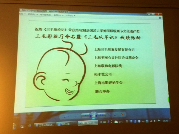 “三毛影视厅”在上海公益新天地举行命名仪式,并放映了故事片《三毛从军记》。“三毛影视厅”是纯公益性质的影视剧放映场所,对孤儿、残疾人、孤老等开放,其中“让有视力障碍者接触电影”活动是一个特色和亮点。合作单位负责人和张乐平部分子女、导演张建亚,以及志愿者等出席仪式。