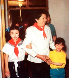 (上)时任全国人大常委会副委员长,全国妇联主席陈慕华接见天津三毛艺术学校学生代表。