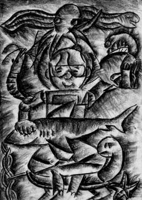 三毛与海底世界(炭笔画)